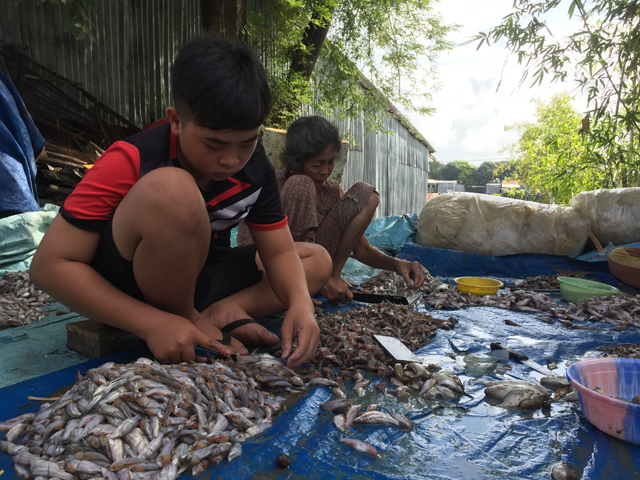 Công đoạn tiếp theo là làm sach ,cá được rửa qua nước muối sau đó cắt bỏ phần đầu và ruột cá rồi mới rửa cá thật sạch, đem để cho ráo nước.